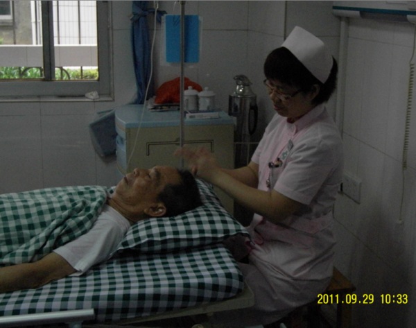 39床黄桂强,74岁,因眩晕1月余入住我科,患者近一个月几乎整夜都不睡。住院第四天,责任护士曾小红为他做了开天门。当我带着护士去查房时,患者和家属开心地对我说:护士长,我们要感谢曾护士,我住院几天了,打了几天针都没睡好,昨天曾护士为我做了头部按摩后,感觉很舒服,昨晚睡得很好!真的要谢谢她!”整个住院过程患者都经常将感谢的话挂在嘴边。