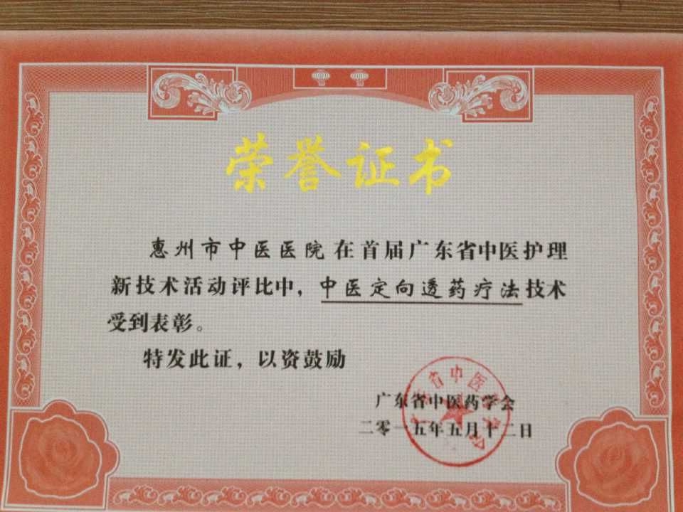 为突出中医护理特色,鼓励中医护理创新,促进中医护理新技术新业务的应用与推广,更好地将中医药特色优势与护理实践有机结合,树立中医护理团队的标杆,全面推进中医护理工作。广东省中医药学会在全省范围内开展“广东省中医特色护理优秀科室”和“广东省中医护理新技术”评选活动。经单位推荐,广东省中医药学会组织护理专家进行评审,我院内一科(心病科)荣获“广东省中医护理特色优秀科室”;该科新开展的护理新技术——中医定向透药疗法,获“广东省中医护理新技术奖”。