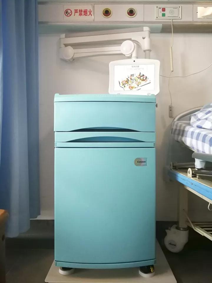平板电脑屏幕尺寸10.1,使用者可自行控制音量,减少环境干扰;屏幕辐射量极低,远小于一般辐射,对人体健康几乎没有影响。平板方向可调节,方便患者在多角度、多体位使用;无线传输机云管理网络技术,保障了平板内容的稳定使用。平板电脑底板与床头柜融为一体,节省空间;平板电脑采用医疗材料,可使用任何方式进行消毒,保障患者安全。自架的5.8G频率的网线,与医院内网不连接、不干扰,保证了医院的信息安全。