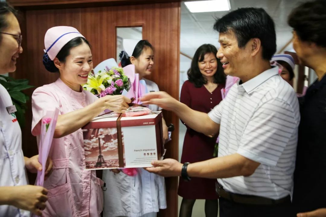 今年护士节恰逢母亲节,为这个天使的节日又增添了一抹光辉。今日清早,《中国护士之歌》在门诊大楼激情回荡,党委书记、院长刘庆荣率院领导班子和护理部工作人员深入临床一线,慰问全院护理工作者,为她们送上了鲜花和蛋糕。