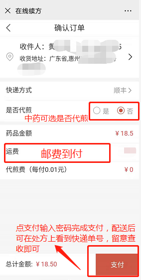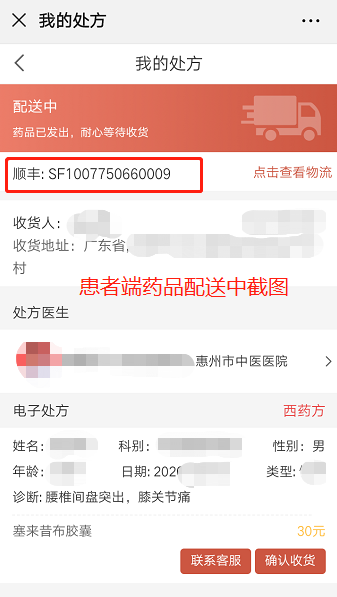 5、快递上门为有偿服务,邮寄费用需到付。 由于在疫情期间快递服务仍未恢复到正常状态,快递到达的时间可能会有所延迟,市内一般48小时内到达。患者可关注顺丰速运公众号及时查询快递信息。