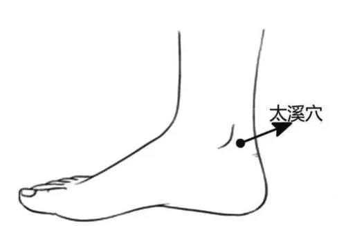 【取穴法】太溪穴位于内踝尖和跟腱之间的凹陷中。