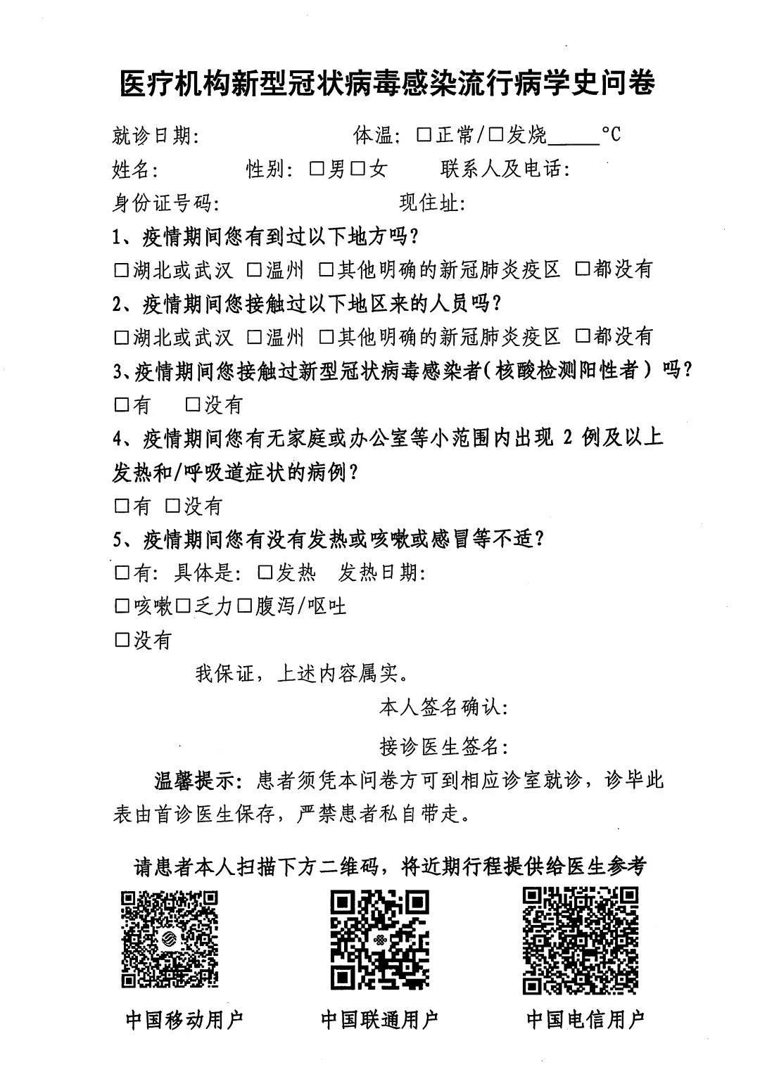4.所有患者在预检分诊处需配合工作人员进行流行病学史调查,如实填写《新型冠状病毒感染流行病学史问卷》并随身携带就诊,请实事求是、切勿隐瞒。(未填表的患者不能进入门诊就诊,当天重复就诊人员携带当天的发票或者门诊日志记录无须重复登记。)