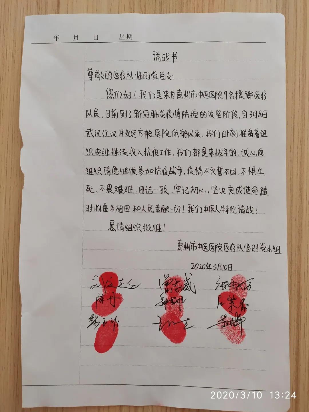 3月10日,他们正式向广东第16批援鄂医疗队临时党总支递交请战书,希望组织继续安排抗疫工作!他们表示:疫情不退,我们不退!哪里有需要,我们就在哪里!
