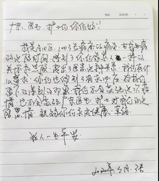“你们能够舍小家为大家,武汉有你们,我们很放心,刚开始住进方舱,我很担心,自从你们广东队进来后,不仅疾病得到了及时治疗,还学会了五禽戏、经络拍打,通利关节,强身壮骨。现在我精神一天比一天好,医生说再复查个CT就差不多可以出院了。五禽戏、经络拍打是我们的国粹,出院后,我还要继续练!”