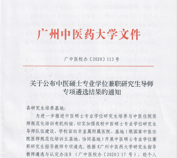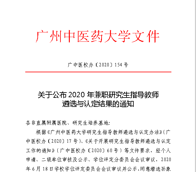 根据《广州中医药大学研究生指导教师遴选与认定办法》(广中医校办〔2020〕17号)、《关于开展研究生指导教师遴选与认定工作的通知》(广中医校办〔2020〕60号)等文件要求,由个人申请、我院遴选、审核及公示,经大学学位评定分委员会会议审议,我院2020年共有9名兼职教师被广州中医药大学遴选认定为研究生指导教师。