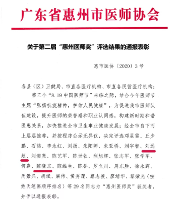 8月19日下午,由惠州市卫生健康局主办、惠州市医师协会承办的第二届“惠州医师奖”揭晓获奖名单,共有29名医师榜上有名。我院刘远超、陈晓东医生荣获“惠州医师奖”。