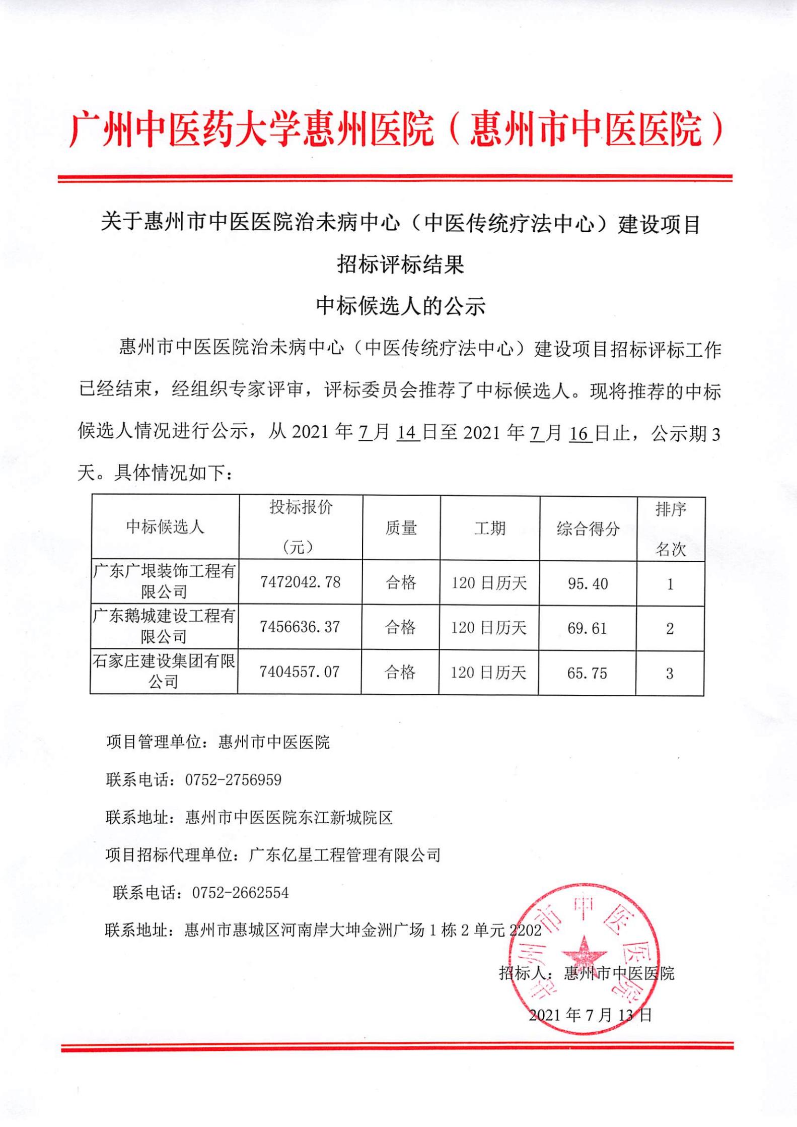 关于惠州市中医医院治未病中心(中医传统疗法中心)建设项目招标评标结果中标候选人的公示