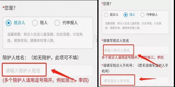 1. 填写本人信息后选择身份,按照要求填写陪护人或就 诊人信息。