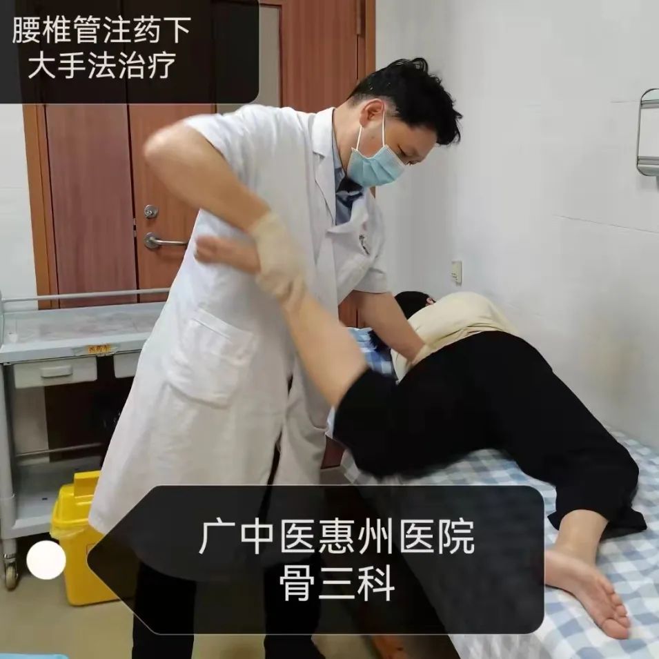 推开广州中医药大学惠州医院(惠州市中医医院)骨伤科诊疗室的门,37岁的周女士正斜倚在床,面朝墙壁。骨伤科三区主任徐振文正给她做“三步一法”的“一法”——腰椎椎管注药。