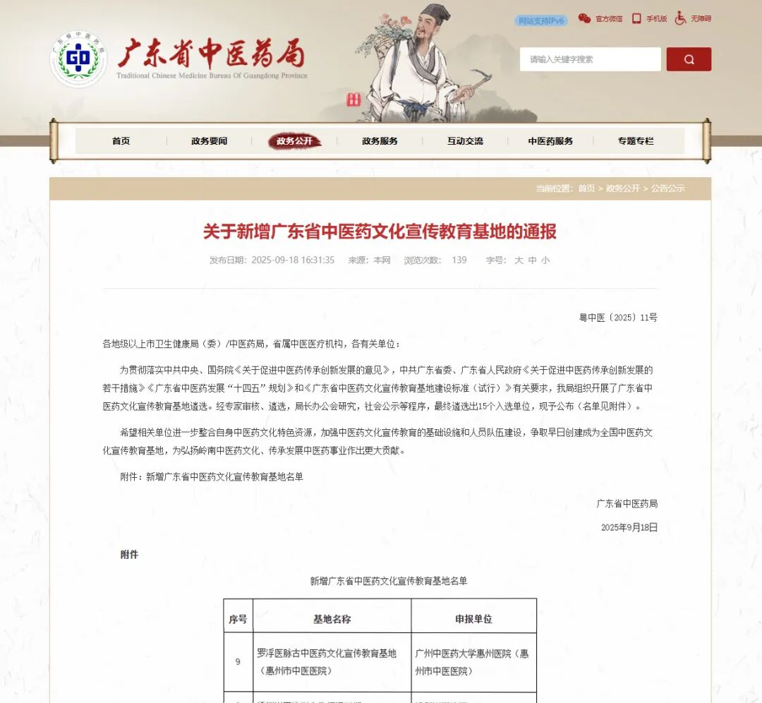 广州中医药大学惠州医院(惠州市中医医院)成功入选广东省中医药文化宣传教育基地。