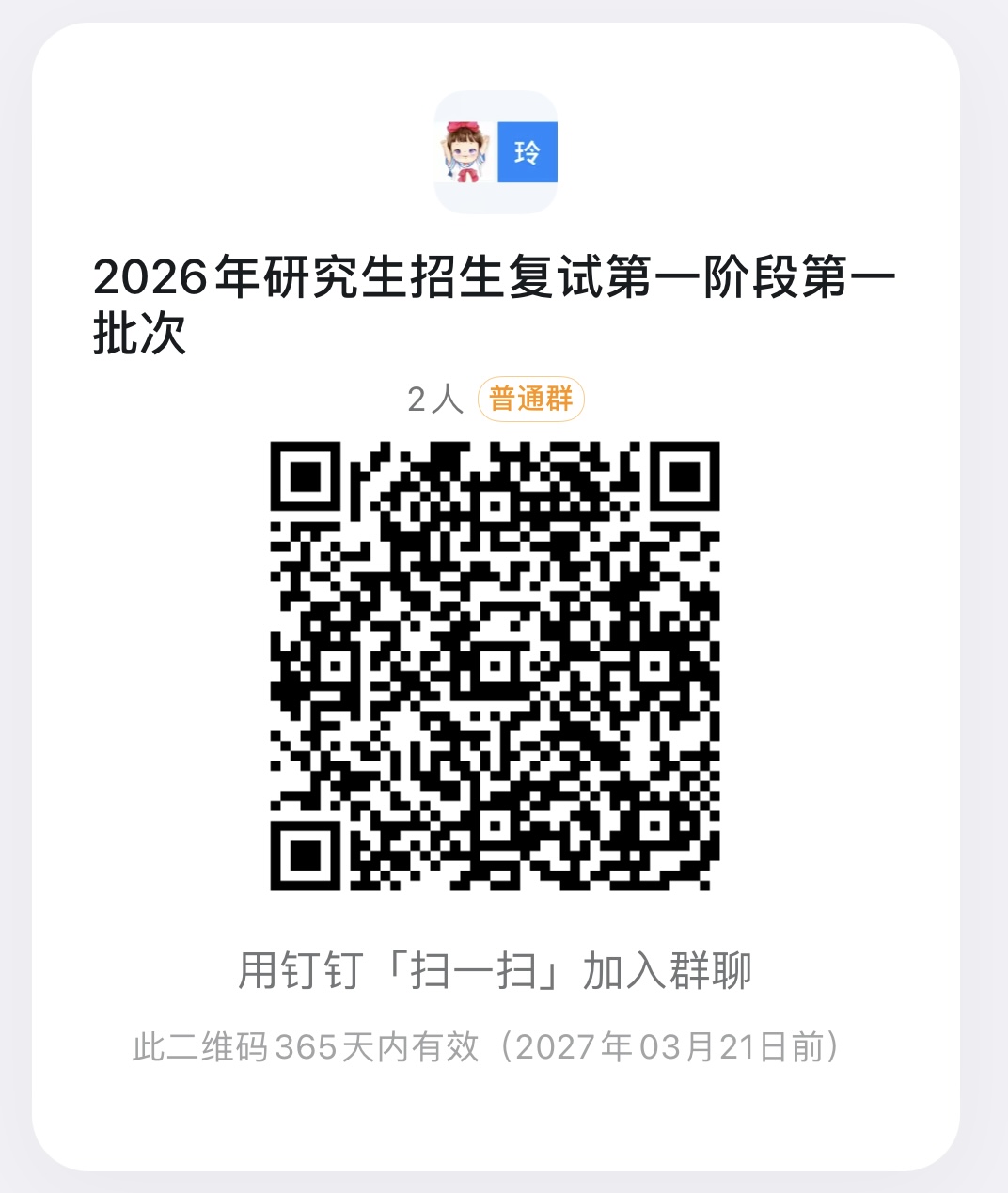 2026年3月 22 日 17:00 前扫描以下钉钉二维码加入2026年硕士研究生复试工作群。 入群备注:考生编号后四位-姓名,可在准考证上查询。
