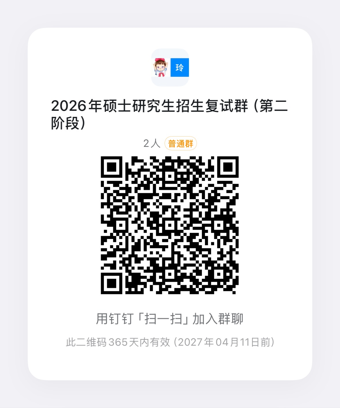 请考生扫描钉钉二维码于4 月12日16:00前加入招生复试钉钉群“2026年硕士研究生招生复试群(第二阶段)”。 复试相关具体安排等重要考务信息将在该群进行通知。
