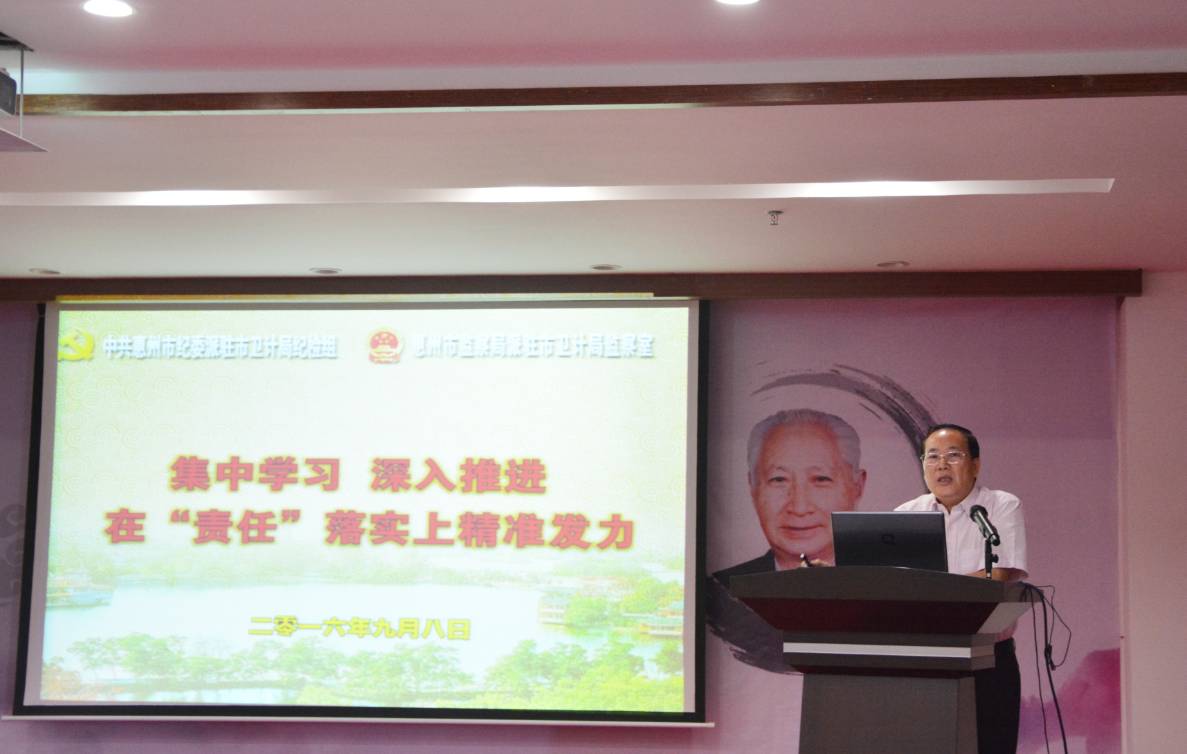 此外,我院特邀市纪委派驻市卫计局纪检组组长杨小敏做《集中学习·深入推进·在责任落实上精准发力》廉政教育专题报告。杨小敏组长的讲课深入浅出、形象生动,从全面落实“两个责任”、贯彻“三严三实”、有机结合“四个形态”到在开展“两学一做”中的“五个坚持”、“五个着力解决”等方面,用丰富的理论知识和身边的事实和案例给大家敲响了反腐保廉的警钟。