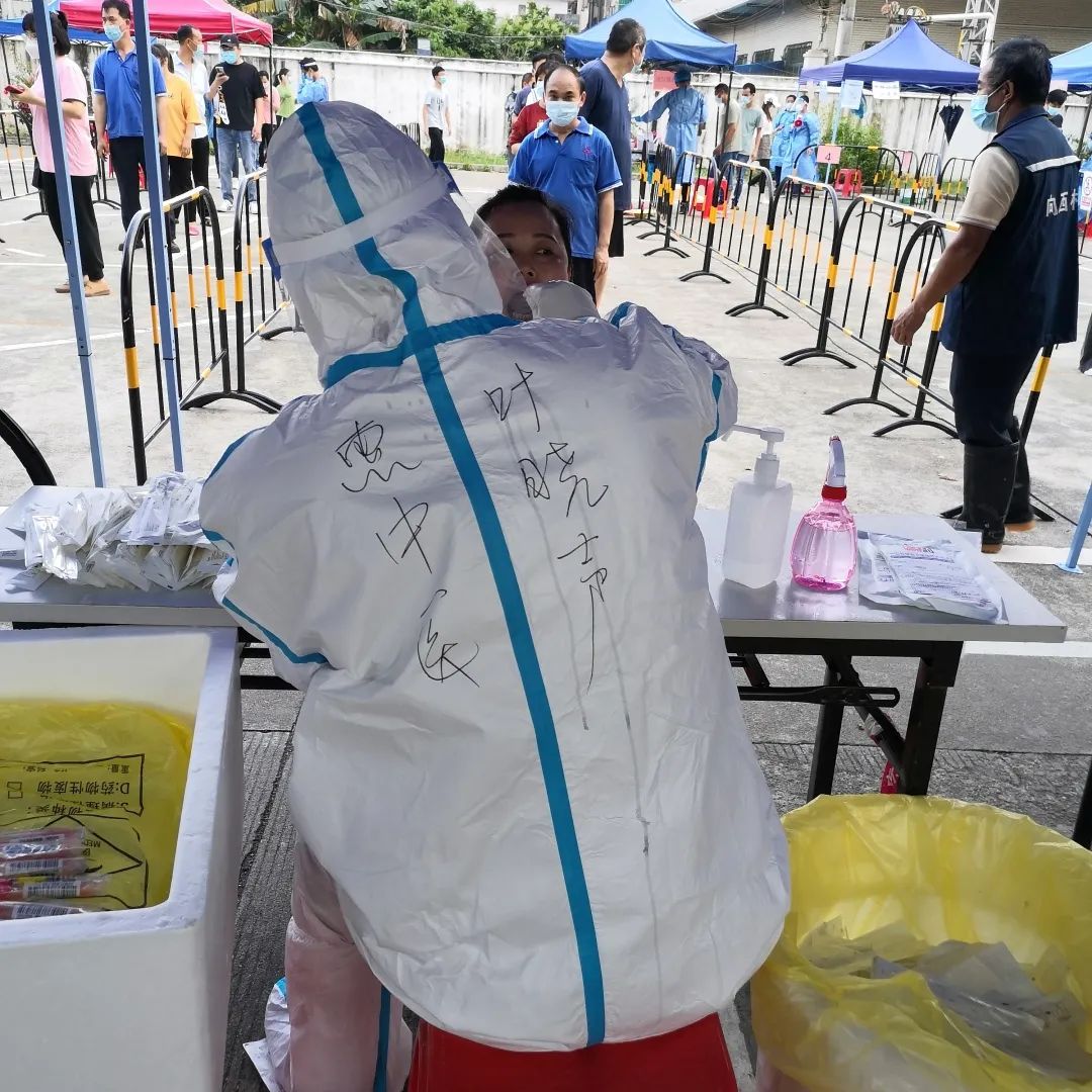 在采样现场,采样队员穿上防护服、戴上护目镜和防护手套默默工作,穿上这套密不透风的装备没多久,他们的衣服很快就湿透了,但是他们仍继续埋头工作,专注、认真、快速地为市民采样,展现出极高的责任心和专业水平。